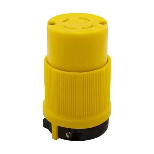 Feature: Corrosion-resistant locking connector design. Benefit: Extends service life in harsh environments and reduces maintenance costs by preventing premature connector failure. Application: Outdoor equipment and wash-down areas where exposure to moisture and chemicals is common. Feature: Back wiring method with #14-8 AWG capacity. Benefit: Faster field termination and fewer wiring mistakes, improving installation efficiency and consistency across multiple machines. Application: Motor starters, power distribution panels, and control cabinets with diverse wiring needs. Feature: NEMA configuration L16-20 and 20A rating. Benefit: Standardized, reliable three-phase connections that simplify procurement and cabinet design, reducing part variety and inventory costs. Application: Industrial machinery and heavy-duty equipment using 480 V three-phase power. Feature: Material integrity nylon body and nickel-plated brass contacts. Benefit: Robust mechanical strength and superior electrical conductivity with corrosion resistance, lowering replacement frequency. Application: Harsh industrial environments and high-vibration installations. Feature: Safety grip and color-coded yellow design. Benefit: Enhanced user handling, safer installations, and clearer wiring identification, boosting operator confidence. Application: Maintenance, installation, and field service teams. Feature: RoHS Compliant and cULus Listed NOM. Benefit: Regulatory alignment and procurement risk reduction, enabling compliant sourcing across global facilities. Application: Compliance-driven purchase for OEMs and end-users in regulated industries.