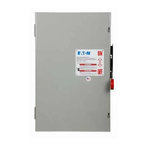 The Eaton DG224FGK general duty cartridge fuse safety switch protects electrical circuits in industrial control panels. It helps overcome startup surges and nuisance trips with a durable NEMA 1 enclosure that’s easy to service in tight control rooms. UL Listed and NEC 230.62 compliant barrier ensure regulatory alignment, while the two-pole, fusible-without-neutral design simplifies wiring and reduces installation time. Rated for 240 V and 200 A, it uses Class H fuses to balance protection and cost, making it a practical choice for general duty safety switching across industrial applications.