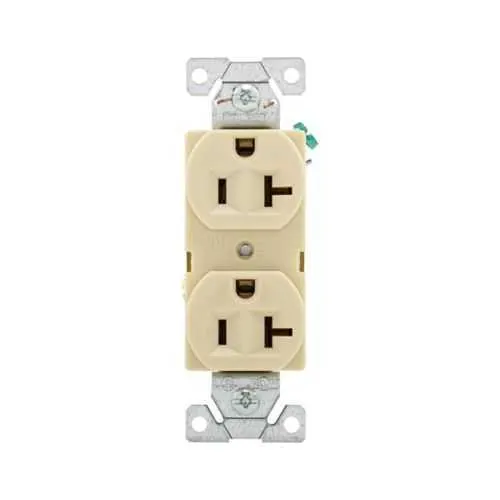 The receptacle provides 20A at 125V with 60 Hz operation and a three-wire configuration for proper grounding. It uses a NEMA 5-20R outlet, is ivory in color, and supports split control for flexible power management in modular panels and enclosures.