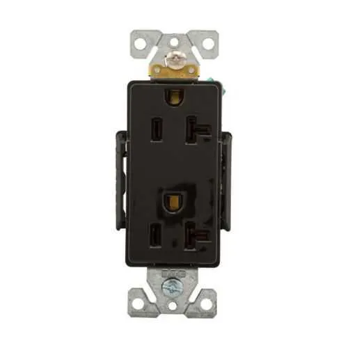 Key specs are 20A amperage, 125 VAC voltage, three wires, NEMA 5-20R configuration, and black color. The device weighs 0.2 lb and fits within dimensions of 1.91 in depth, 4.4 in height, and 1.75 in width, suitable for compact panel installations and modular decorator configurations.