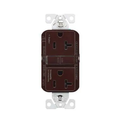 The unit is a 20A, 125Vac GFCI with 3 wires. It features tamper-resistant construction and a brown color to match standard installations. These specs support typical branch-circuit protection in commercial and industrial settings while complying with applicable safety standards.