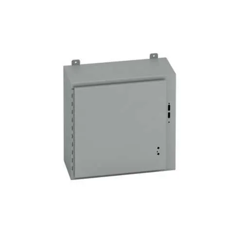 The enclosure is designed for wall mounting with external mounting feet, enabling secure attachment to vertical surfaces. It features a hinged cover and a removable cover option for service access. The 30 in x 25 in x 12 in footprint fits standard electrical room layouts and compatibility with typical disconnect assemblies reduces field fabrication time and installation risk.