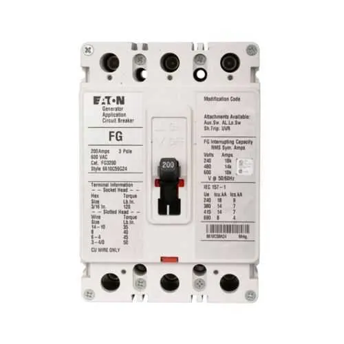 FG3175 Eaton: Eaton Series C complete EG molded case circuit breaker, F-frame, FG, Fixed thermal and magnetic trips, Three-pole, 175A, 600 Vac, 18 kAIC at 240 Vac, 14 kAIC at 480 Vac, Line/load, Engine generator, Reverse, 60 Hz, Fixed