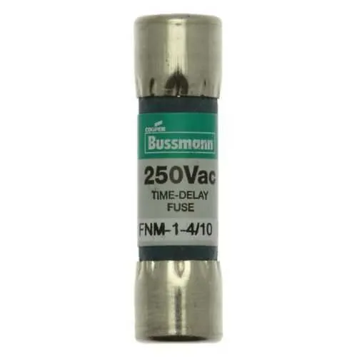 FNM-1-4/10 Eaton: Eaton Bussmann series FNM fuse, Time-delay, 1.4 A, Dual, Non-indicating, Ferrule end x ferrule end, 10 kAIC at 125 Vac, 100 AIC at 250 Vac, Nickel-plated bronze endcap, Standard, 250 V
