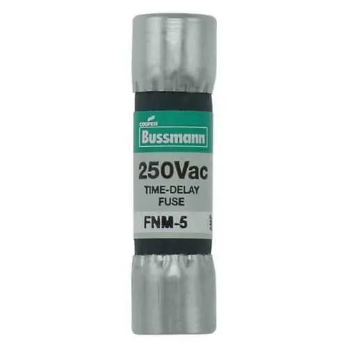 FNM-5 Eaton: Eaton Bussmann series FNM fuse, Time-delay, 5 A, Dual, Non-indicating, Ferrule end x ferrule end, 10 kAIC at 125 Vac, 200 AIC at 250 Vac, Nickel-plated bronze endcap, Standard, 250 V