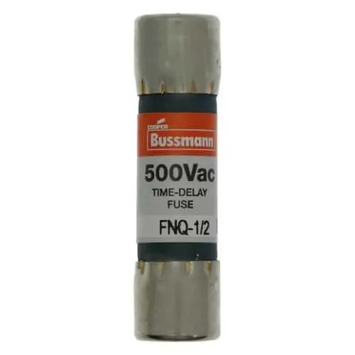 FNQ-1/2 Eaton: Eaton Bussmann series FNQ fuse, Time-delay, Motor control transformers, Circuits with in-rush currents, 0.5 A, Non-indicating, Ferrule end x ferrule end, 10 kAIC at 500 Vac, Nickel-plated bronze endcap, Standard, 500 V