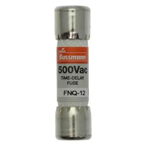 FNQ-12 Eaton: Eaton Bussmann series FNQ fuse, Time-delay, Motor control transformers, Circuits with in-rush currents, 12 A, Non-indicating, Ferrule end x ferrule end, 10 kAIC at 500 Vac, Nickel-plated bronze endcap, Standard, 500 V