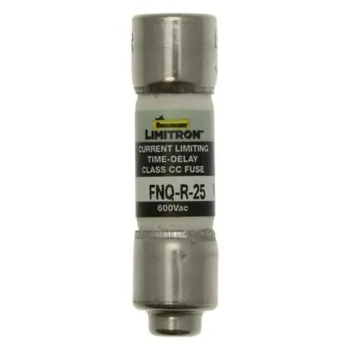 FNQ-R-25 Eaton: Eaton Bussmann Series Class CC fuse, FNQ, time-delay, dual-element current limiting fuse, 25 A, rejection style fuse, interrupting rating of 200kA at 600Vac