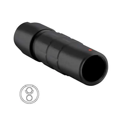 This model features two male contacts, a size 1 format, and a straight backshell with a sealing gland for reliable sealing. It delivers IP40/IP68 protection, UL 1977 compliance, and a compact 42 mm length with 13 mm width and height. The design supports robust mating cycles and secure cable routing suitable for automated machinery and control panels.
