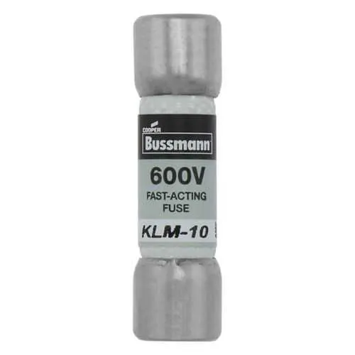 KLM-10 Eaton: Eaton Bussmann series KLM fuse, 10 A, Non-indicating, Ferrule end x ferrule end, 50 kAIC at 600 Vdc, 100 kAIC at 600 V, Nickel-plated bronze endcap, Melamine tube, 600 V, 600 Vdc