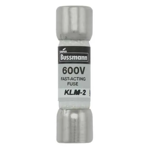 KLM-2 Eaton: Eaton Bussmann series KLM fuse, 2 A, Non-indicating, Ferrule end x ferrule end, 50 kAIC at 600 Vdc, 100 kAIC at 600 V, Melamine tube, Nickel-plated bronze endcap, 600 V, 600 Vdc