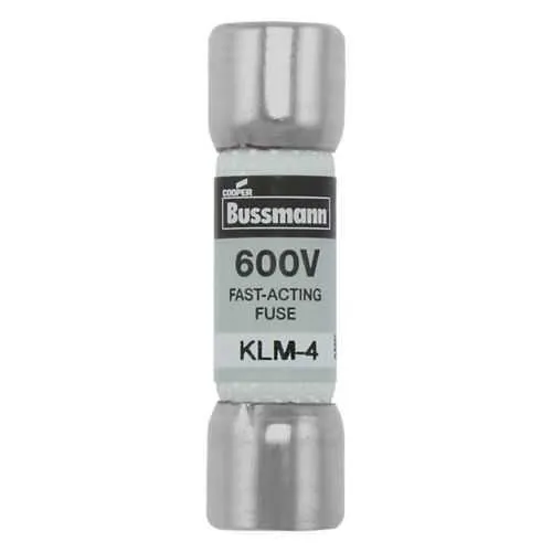 KLM-4 Eaton: Eaton Bussmann series KLM fuse, 4 A, Non-indicating, Ferrule end x ferrule end, 50 kAIC at 600 Vdc, 100 kAIC at 600 V, Nickel-plated bronze endcap, Melamine tube, 600 V, 600 Vdc