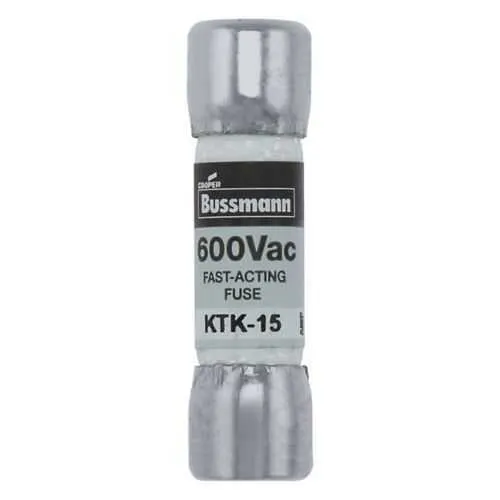 KTK-15 Eaton: Eaton Bussmann series KTK fuse, Control circuits, Lighting circuit protection, Meter circuits, 15 A, Non-indicating, Ferrule end x ferrule end, 100 kAIC at 600 V, Melamine tube, Nickel-plated bronze endcap, 600 V