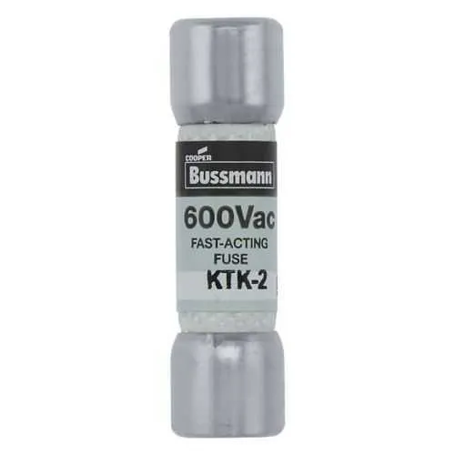 KTK-2 Eaton: Eaton Bussmann series KTK fuse, Control circuits, Lighting circuit protection, Meter circuits, 2 A, Non-indicating, Ferrule end x ferrule end, 100 kAIC at 600 V, Melamine tube, Nickel-plated bronze endcap, 600 V