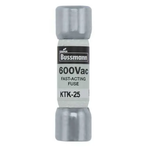 KTK-25-G1 Eaton: Eaton Bussmann series KTK fuse, Control circuits, Lighting circuit protection, Meter circuits, 25 A, Non-indicating, Ferrule end x ferrule end, 100 kAIC at 600 V, Melamine tube, Nickel-plated bronze endcap, 600 V