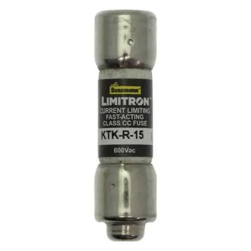 KTK-R-15 Eaton: Eaton Bussmann Series Class CC fuse, KTK-R, fast-acting, dual-element current limiting fuse, 15 A, rejection style fuse, interrupting rating of 200kA at 600Vac