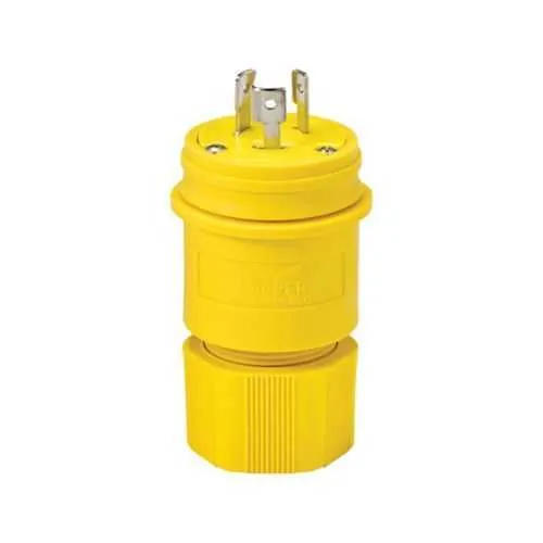 Feature — IP67 watertight protection and a 20A, 250V rating ensure safe operation in wet, dusty environments. Business impact — Moisture resistance minimizes field failures and downtime, extending equipment life and reducing maintenance costs. Application — Ideal for outdoor enclosures, wet locations, and heavy-duty motor controls in manufacturing, food and beverage, and mining sectors. Feature — Three-pole, three-wire L11-20 configuration delivers a standardized, secure connection for industrial power cords. Business impact — Improves compatibility and reduces rework by aligning with common receptacles on the shop floor, saving installation time. Application — Use with compatible Eaton Arrow Hart receptacles in control cabinets and equipment in harsh environments. Feature — Back wiring method supports #18-10 AWG conductors with a 0.43–1.15 in cord diameter range. Business impact — Streamlines field terminations and reduces dependency on crimping, boosting installation speed and consistency. Application — Suitable for programmable logic controllers, motor starters, and power distribution blocks in rugged facilities. Feature — Santoprene body and yellow color provide chemical resistance, durability, and high visibility. Business impact — Enhances safety and reliability, aiding quick identification during maintenance. Application — Useful in high-visibility wiring looms and safety-critical panels across oil, gas, and mining operations. Feature — Watertight locking mechanism and steel contact material improve mechanical strength and engagement security. Business impact — Minimizes accidental disengagement and contact wear, extending life in vibration-prone equipment. Application — Fits in Arrow Hart modular systems for long-term reliability in conveyors, packaging lines, and processing equipment.