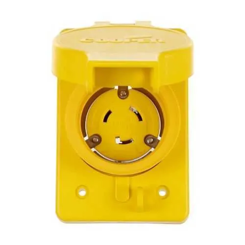 Feature: Watertight design with IP66 and NEMA 3R/4X protection. Business Impact: Reduces water ingress, corrosion, and unscheduled downtime. Application: Outdoor equipment, washdown zones, and rugged field installations. Feature: Locking receptacle for secure connections. Business Impact: Prevents accidental disconnections in vibration-heavy environments, improving safety and productivity. Application: Industrial machinery, portable power carts, and stages. Feature: Back-wiring compatibility with #14-8 AWG and torque ratings for #10-14 AWG; precise terminations. Business Impact: Faster, more reliable terminations with consistent torque, lowering rework costs. Application: On-site wiring and service panels. Feature: Glass-filled nylon face, thermoplastic body, and nickel-plated bronze contacts. Business Impact: Enhanced chemical resistance, heat tolerance, and longevity in demanding settings. Application: Harsh factories, outdoor enclosures, and washdown zones. Feature: Visible yellow color and regulatory certifications (UL, cULus, CSA, NOM). Business Impact: Easier identification, safer handling, and streamlined compliance processes. Application: Regulated facilities and installation compliance workflows. Feature: NEMA L5-20 configuration, two-pole three-wire, 125 V, 20 A. Business Impact: Clear compatibility with common portable power needs, reducing mis-wiring risk. Application: Industrial tools, temporary power distribution, and outdoor equipment.