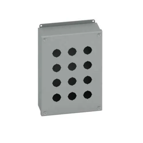PB12 push button enclosures from Eaton protect control panels by housing push-button assemblies in demanding industrial environments. If wiring clearance or maintenance access is tight, these compact, surface-mounted enclosures simplify installation and reduce downtime. Backed by UL 508A and CSA C22.2 certifications and a NEMA 12 rating, they deliver dependable protection against dust, splash, and incidental spills. With a painted ANSI 61 gray finish and a hinged door, the PB12 also supports easy labeling and quick field servicing, while its compatibility with Eaton B-Line components enables scalable panel builds across facilities. Whether you’re designing a new line or upgrading legacy equipment, PB12 enclosures offer predictable fit, robust guarding, and long-term cost savings.