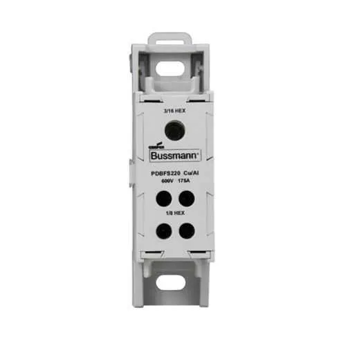 PDBFS220 Eaton: Eaton Bussmann series PDBFS power distribution block, IP-20 Finger-safe, 600 Vac, 600 Vdc, 175 A, SCCR: 200 kA (12 To 4 AWG), 100 kA (14 To 4 AWG), DIN rail, panel, Tin-plated aluminum connectors