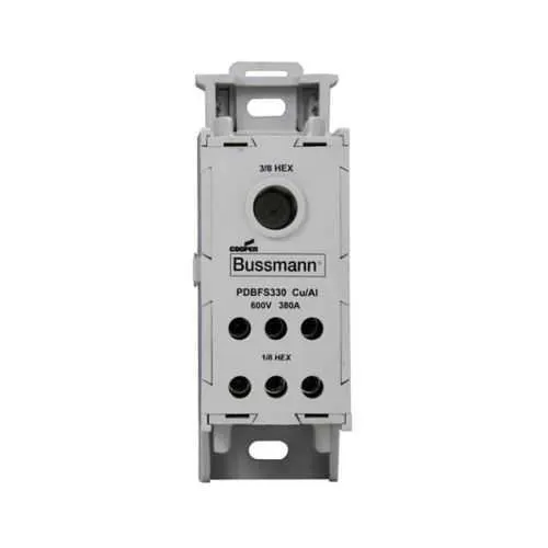 PDBFS330 Eaton: Eaton Bussmann series PDBFS power distribution block, IP-20 Finger-safe, 600 Vac, 600 Vdc, 380 A, SCCR: 200 kA (6 To 2 AWG), 100 kA (14 To 2 AWG), Panel, Tin-plated aluminum connectors