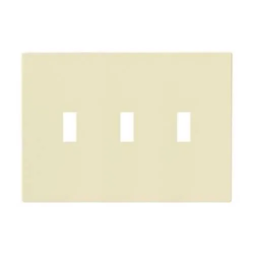 Feature: Screwless design eliminates visible fasteners for a clean, continuous wall surface. Business Impact: speeds installation and reduces rework by avoiding screw alignment issues and loose trim. Application: perfect for healthcare and corporate spaces where aesthetics and quick upgrades matter. Feature: Three-gang, mid-size footprint fits standard back-box layouts. Business Impact: minimizes the need for box modification and simplifies procurement for contractors. Application: retrofit and new construction in offices and classrooms. Feature: Almond color and polycarbonate material offer durable, code-compliant performance. Business Impact: resists impact and maintains appearance in high-traffic areas, reducing replacement costs. Application: durable wallplates for industrial and commercial installations. Feature: RoHS compliance and UL/cULus certifications ensure regulatory alignment. Business Impact: streamlines compliance checks and improves contractor confidence, reducing project risk. Application: electrical installations subject to code approvals and product authentication. Feature: Toggle cutout supports common light and switch configurations. Business Impact: ensures plug-and-play compatibility with existing devices, cutting down device swap time. Application: standard electrical outlets and light-switch assemblies. Feature: Lightweight, mid-size 4.87 in H x 6.75 in W footprint with 0.08 in depth. Business Impact: enables easy packaging and transport for job sites, while fitment in most wall boxes is preserved. Application: new builds and retrofit installations.