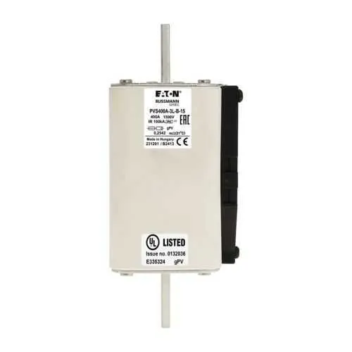 Eaton PVS400A-3L-B-15 Photovoltaic fuses protect solar inverters and PV arrays by interrupting fault currents. When field conditions expose strings to overcurrent or arc faults, downtime and warranty costs rise. It carries CE marking and UL listing, plus IEC 60269 compliance, ensuring regulatory alignment in global solar installations. Designed for photovoltaic protection with 3L size and 1500 V ratings, this fuse supports reliable inverter protection while enabling compliant, easy installation. Its 3L fuse size and side indicator aid quick status checks in field cabinets. Rated 400 A at 1500 V and 100 kAIC interrupt capability, it protects PV strings against high fault currents. Fitted with a side indicator for at-a-glance status monitoring reduces maintenance time.