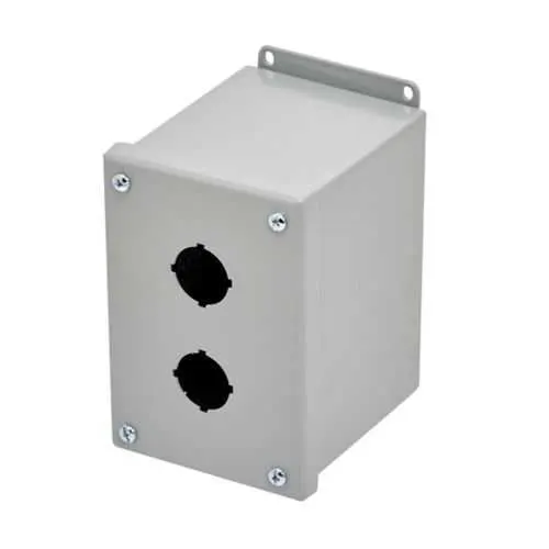 PVX2 combines a compact footprint with a heavy-duty carbon steel shell. The enclosure measures 6 in tall, 4 in wide, and 4.75 in deep, with a 16 gauge wall and a painted ANSI 61 gray finish. This combination yields a sturdy home for push-button interfaces while preserving valuable panel real estate. The surface-mount design and external mounting feet simplify retrofit and new-build installations in tight control rooms and machine bays. With a NEMA 12 rating and an oil-resistant gasket, PVX2 protects internal components from dust, water splash, and compatible fluids common in manufacturing environments. This reduces maintenance cycles and extends component life, even under rough handling. The screw cover provides straightforward access for routine wiring checks without exposing the interior to the environment, while external mounting feet support quick alignment and leveling during panel assembly. Constructed from carbon steel with ANSI 61 gray painted finish, PVX2 withstands shop conditions and pairs with standard push-button components. UL 508A and CSA C22.2 certifications promote regulatory compliance across North America, and the unit is designed to integrate with PVX enclosure family accessories and common mounting hardware. From control panels to motor start stations, PVX2 delivers consistent protection in medium-duty environments. The durable design reduces replacement costs and supports long service life, delivering a favorable return on investment for OEMs and maintenance teams. Its compatibility with surface mounting and external feet streamlines installation across diverse industrial applications.