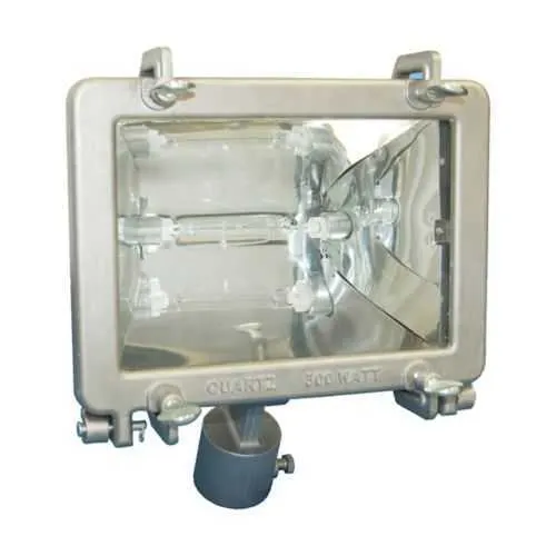 The luminaire operates at 120 VAC with a 500 W quartz halogen lamp, offering immediate full illumination. Its electrical design supports reliable performance in outdoor or exposed environments while maintaining compatibility with standard 120 V power distribution systems.