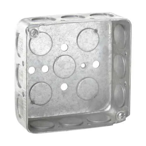 TP410 Eaton: Eaton Crouse-Hinds series Square Outlet Box, (5) 1/2", 4", Conduit (no clamps), Drawn, 1-1/2", Steel, (12) 1/2", 22.0 cubic inch capacity
