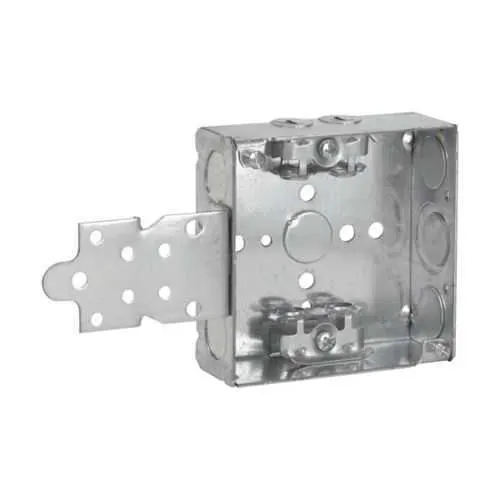 Feature: 4-inch square box with 22 cubic inches of capacity. Business Impact: Ample internal space improves wiring readability and allows for future expansion without rework. Application: Ideal for control panels and machine enclosures in automated lines. Feature: 1-1/2 inch depth with compact 4 inch footprint. Business Impact: Enables easier mounting in tight panels and crowded machinery spaces, reducing enclosure depth while maintaining access. Application: Suitable for space-constrained control cabinets and machine housings. Feature: Side knockouts (two 1/2 in, one 1/2 in, one 3/4 in E) and bottom knockout (1/2 in). Business Impact: Flexible conduit routing and simplified field wiring, lowering install time and errors. Application: Wiring terminations in complex assemblies and equipment with mixed conduit needs. Feature: AC/MC clamps included; welded steel construction. Business Impact: Quick, secure wiring with durable mechanical protection, reducing field adjustments post-install. Application: Industrial environments requiring reliable conduit connections to panels. Feature: Ground screw with pigtail lead included. Business Impact: Streamlines grounding, improves safety, and supports consistent electrical performance. Application: All control-panel terminations requiring solid grounding. Feature: Material: Steel; Weight: 0.89 lb; Certifications: NEC/CEC, Ordinary/Non-Hazardous Locations. Business Impact: Durable yet manageable weight for handling and shipping; compliance reduces risk during audits. Application: Everyday use in manufacturing, process, and automation environments.