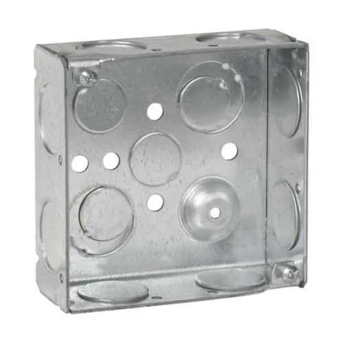 TP467 Eaton: Eaton Crouse-Hinds series Square Outlet Box, (2) 1/2", (2) 1/2", (1) 3/4" E, 4", Conduit (no clamps), Welded, 1-1/2", Steel, (8) 3/4", 22.0 cubic inch capacity