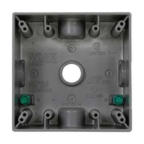 TP7118 Eaton: Eaton Crouse-Hinds series weatherproof outlet box, 30.5 cu in, Gray, 2" deep, Die cast aluminum, Two-gang, (5) 1/2" outlet holes, one hole around each of the four sides, one hole in the back