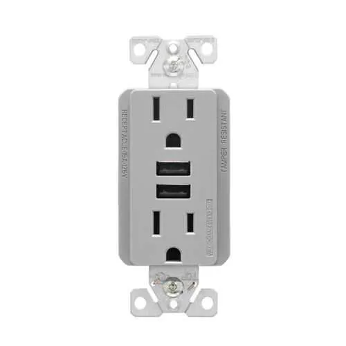 TR7765GY-BOX USB charger with duplex receptacle provides convenient charging at desks, panels, and rugged industrial enclosures. For engineers juggling mixed device loads, cluttered power strips and portable chargers slow response times and complicate maintenance. Key certifications such as cULus Listed validate safety for commercial environments while the Type A 15A/125V rating supports reliable, code-compliant operation. In practice, this unit supports efficient charging without sacrificing receptacle capacity, helping reduce panel footprint and wiring complexity. This makes it easier to retrofit existing installations, minimize panel work, and speed field wiring with screw terminals and defined wire sizes. With a compact profile and brass contacts for reliable mating, technicians gain confidence during commissioning and future changes.