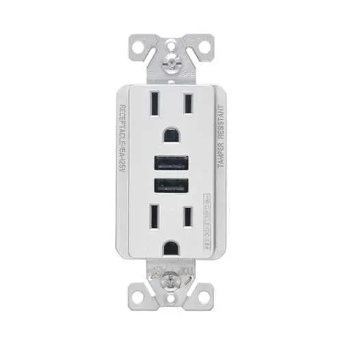 The unit provides a 3.6 A USB charging capability integrated into a standard 15 A, 125 V receptacle. This combination device eliminates the need for separate USB adapters, enabling simultaneous device charging and appliance use. This is particularly advantageous in offices, labs, and manufacturing floors where compact, all-in-one power solutions improve productivity and reduce wall clutter.