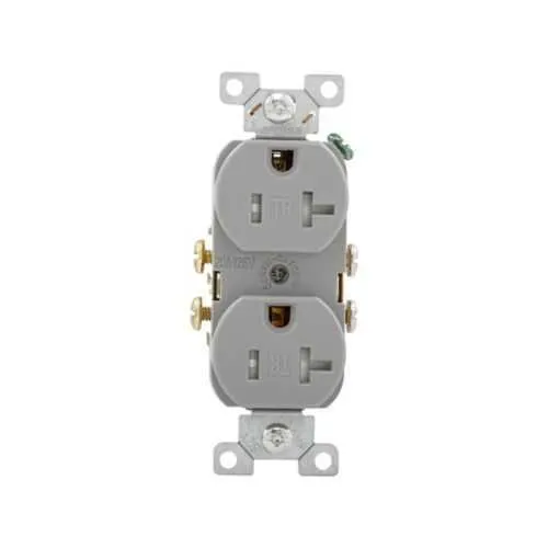 TRCR20GY Eaton: Eaton commercial specification grade duplex receptacle, #14-10 AWG, 20A, Commercial, Flush, 125V, Side wire, Gray, Brass, Impact-resistant nylon face, PVC body, 5-20R, Duplex, Screw, PVC, Core pack