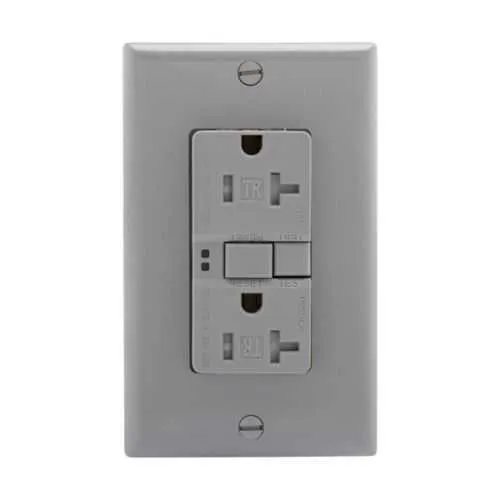 TRSGF20FGY Eaton: Eaton GFCI receptacle,NAFTA compliant,Tamper resistant,Self-test,#14 - 10 AWG,20A,Residential,Commercial,Flush,125 V,GFCI,Back and side wire,Gray,Brass,Receptacle,Tamper resistant,Polycarbonate,5-20R,Two-pole, three-wire, grounding