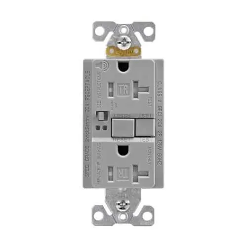 TRSGFA20GY Eaton: Eaton GFCI receptacle,Audible alarm,Tamper resistant,Self-test,#14 - 10 AWG,20A,Residential,Commercial,Flush,125 V,GFCI,Back and side wire,Gray,Brass,Receptacle,Tamper resistant,Polycarbonate,5-20R,Two-pole, three-wire, grounding