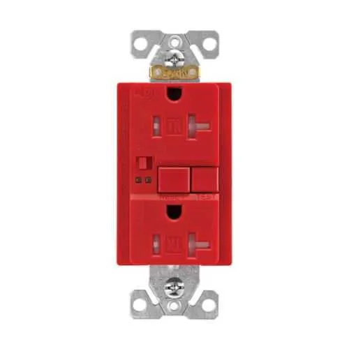 TRSGFA20RD Eaton: Eaton GFCI receptacle,Audible alarm,Tamper resistant,Self-test,#14 - 10 AWG,20A,Residential,Commercial,Flush,125 V,GFCI,Back and side wire,Red,Brass,Receptacle,Tamper resistant,Polycarbonate,5-20R,Two-pole, three-wire, grounding