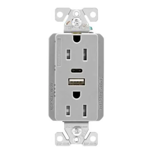TRUSBAC15GY-BOX USB charger with duplex receptacle provides integrated charging for outlets in commercial and industrial spaces. This single device blends power delivery with USB efficiency, reducing clutter and the need for portable adapters in high-traffic work areas. Engineers face limited space, multiple devices, and maintenance challenges; this solution streamlines installs and improves user experience. The unit carries NOM and cULus Listed certifications, reinforcing safety and regulatory compliance across North American environments. With 15A at 125V, USB Type A and C charging, and tamper-resistant protection, it supports everyday devices while meeting code requirements. Designers benefit from flush mounting and reliable brass contacts, while facilities teams gain faster installs and lower field support costs. Secondary benefits include compatibility with #12-14 AWG wiring and compact form factor for retrofit projects.