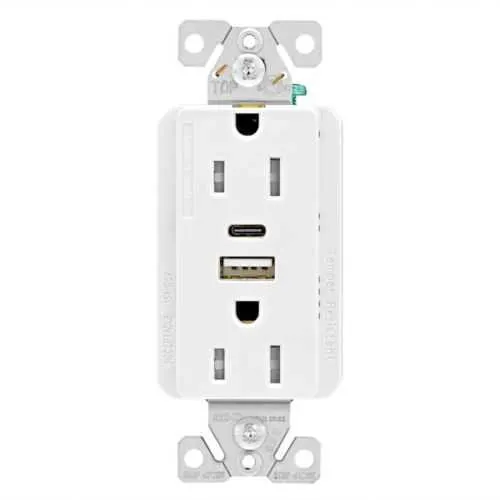 Feature → Business Impact → Application: The TRUSBAC15W-BOX combines a USB charger with a duplex receptacle, reducing part count and installation time, which translates to lower labor costs and fewer inventory SKUs in panel builds. Application: ideal for control panels, electronics enclosures, and equipment rooms where both charging and standard power are needed. Feature → Business Impact → Application: 15A at 125V with NEMA 5-15R compatibility ensures reliable power delivery for common tools and devices, improving uptime and reducing nuisance trips in industrial spaces. Application: machine shops, maintenance bays, and service desks. Feature → Business Impact → Application: USB Type A and C charging plus tamper-resistant protection increases safety and user satisfaction, decreasing device damage risk in high-traffic areas. Application: workshops and classrooms within industrial facilities. Feature → Business Impact → Application: screw-terminal wiring for #12-14 AWG offers secure, robust connections that withstand vibration and thermal cycling, reducing re-termination risk. Application: retrofit projects and new installations in rugged environments. Feature → Business Impact → Application: flush decorator mounting and brass contact materials deliver a durable, professional look that supports code-compliant, long-term installations. Application: commercial enclosures and energy management spaces. Feature → Business Impact → Application: two-pole, three-wire grounding configuration simplifies compliance with electrical codes while maintaining ease of replacement and serviceability. Application: retrofits in retrofit-ready bussing or modular panel systems. Gear and inventory considerations: the device aligns with standard wiring devices and connectivity ranges to minimize stockouts and expedite procurement.