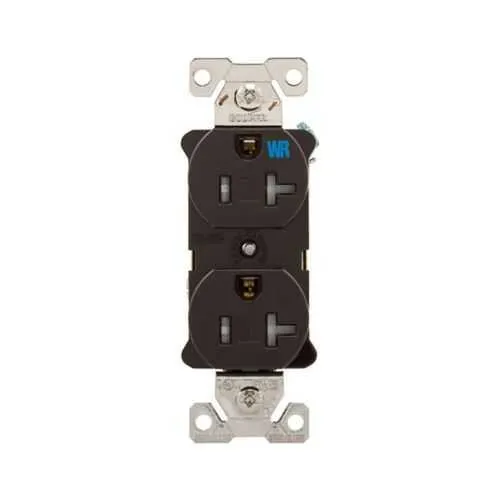 TWRBR20B Eaton: Eaton commercial specification grade duplex receptacle,#14-10 AWG,20A,Commercial,Flush,125V,Back and side,Brown,Nickel-plated brass,Weather resistant,Impact-resistant nylon face,Glass-filled nylon base,5-20R,Duplex,Screw,Nylon,Core pack