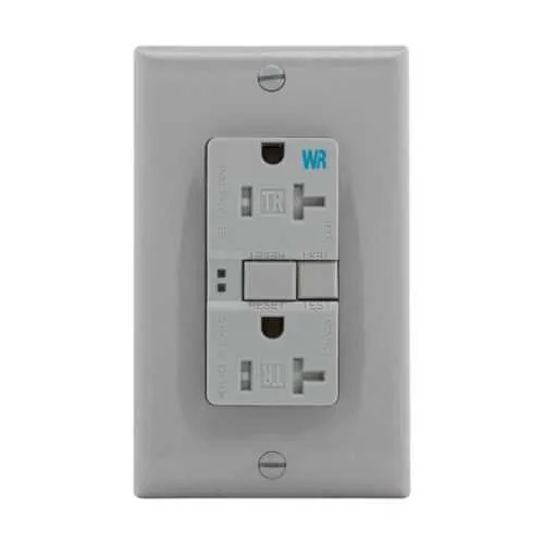 TWRSGF20FGY Eaton: Eaton GFCI receptacle,NAFTA compliant,Weather resistant,Tamper resistant,Self-test,#14 - 10 AWG,20A,Residential,Commercial,Flush,125 V,Back and side wire,Gray,Brass,Tamper and weather resistant,Polycarbonate,5-20R,2-pole,3-wire,grounding
