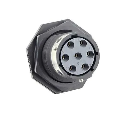 Feature: IP68/69K sealing and jam-nut receptacle design. Business impact: Superior ingress protection reduces downtime and maintenance costs in harsh environments. Application: outdoor automation, marine equipment, and rugged conveyors. Feature: 1/3 Bayonet coupling. Business impact: Fast, secure mating saves installation time and minimizes misalignment. Application: panel-mounted controls, mobile machinery, and field-deployed systems. Feature: 7 solder-contact sockets. Business impact: Reliable electrical connections with robust tolerance to vibration; Application: seven-wire sensor and power/data runs in automation cabinets. Feature: Operating range -40 °C to 105 °C. Business impact: Uninterrupted performance across extreme climates; Application: outdoor industrial enclosures and offshore equipment. Feature: RoHS/REACH and UL94 V0 compliance. Business impact: Regulatory and fire-safety assurance; Application: regulated environments and high-reliability deployments.