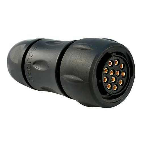 IP68/IP69K protection with a sealing gland backshell provides superior ingress protection in washdown and outdoor environments, reducing maintenance downtime and extending equipment life. This translates to lower total cost of ownership and higher uptime in harsh production lines and mobile machinery. The 12‑cavity layout consolidates wiring into a compact footprint, cutting harness complexity and enabling quicker diagnostics and servicing in automation panels and sensor arrays. The 1/3 bayonet coupling enables rapid mating and unmating, especially in constrained or hard-to-reach installations, improving serviceability on crowded machines. Operating temperature range from -40 to 105 °C and UV resistance ensure reliable operation across seasonal outdoor exposure and high-temperature processes, reducing failure risk in unmanned or remote sites. Compliance to IEC 61984, UL 1977, and CSA‑C22.2 No.182.3 ensures safety and interchangeability across global supply chains, easing design validation and supplier qualification. The plastic shell with polyamide insert keeps weight low while maintaining toughness, supporting portable equipment and robotics where payload and handling matter. Cable diameter compatibility from 5 to 14 mm provides flexibility to procure standard cables without changing glands, aiding bulk purchasing and reducing spare parts variety. With 250 mating cycles, the UTS6JC1412S balances durability with cost, delivering predictable performance for routine maintenance cycles. The straight plug orientation simplifies routing in tight enclosures, while the backshell backgland design enhances sealing, decreasing the likelihood of moisture ingress during field service. The connector is designed for crimp contacts, enabling fast, reliable terminations and consistent mechanical integrity across wiring harnesses in complex equipment.