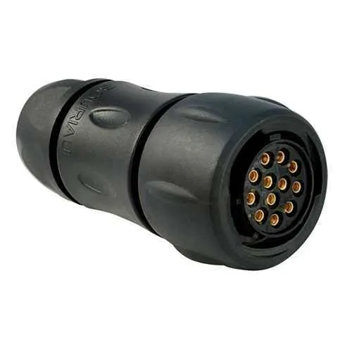 Feature → Business Impact → Application: The connector offers 12 female contacts in a straight plug with 1/3 bayonet coupling, enabling rapid, tool-free mating and reliable high-vibration operation; this reduces installation time and field failure rates in mobile machinery and robotics. The IP68 rating and sealing gland backshell minimize water ingress and corrosion risks, boosting uptime for outdoor conveyors and washdown environments while cutting warranty costs. The polyamide insert and plastic shell provide durable insulation and chemical resistance, improving long-term performance in harsh oils and UV exposure encountered in construction and agricultural equipment. With operating temperatures from -40 °C to 105 °C and a mating cycle specification of 250, maintenance windows are simplified and routine replacements become predictable, ensuring compliance in regulated facilities. The 12‑contact arrangement supports complex sensing and power delivery needs in industrial automation panels and control cabinets.