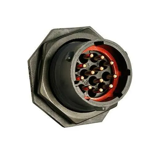 The connector offers about 250 mating cycles, designed for maintenance-heavy equipment. It uses a polyamide insert inside a plastic shell, with an aluminium jam nut. The 12-position layout uses crimp contacts and a 1/3 bayonet coupling, delivering reliable engagement and ease of servicing in demanding settings.