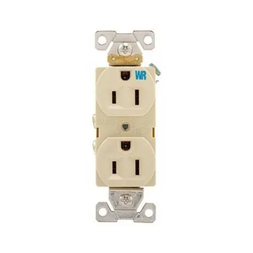 WRBR15V Eaton: Eaton commercial specification grade duplex receptacle, #14-10 AWG, 15A, Commercial, Flush, 125V, Back and side, Ivory, Brass, Weather resistant, Impact-resistant nylon face, Glass-filled nylon base, 5-15R, Duplex, Screw, Nylon, Core pack
