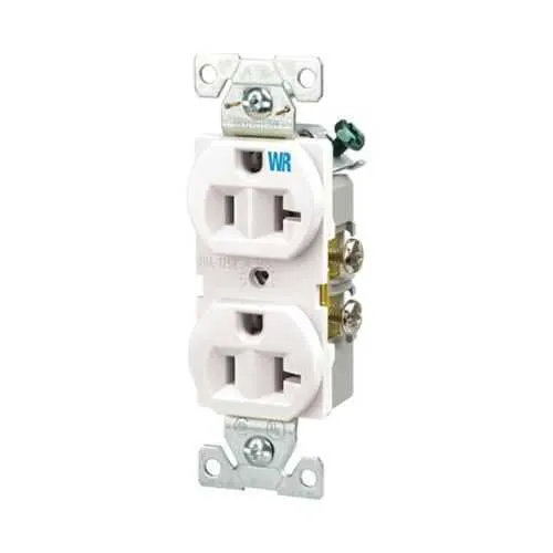 The Eaton WRBR20W Receptacle is a weather-resistant duplex outlet designed for commercial spaces needing reliable 125V power. Facility managers often contend with moisture, corrosion, and grounding issues that drive downtime and replacement costs. This device carries cULus Listed and NOM certifications, ensuring North American safety compliance in demanding environments. Its flush mounting and back-and-side wiring simplify installation, while the glass-filled nylon body and brass contacts deliver durability under heavy use. Designed to support commercial wiring projects efficiently, WRBR20W helps reduce install time and ongoing maintenance while aligning with key long-tail needs like NEMA configuration and 20A, 125V performance.