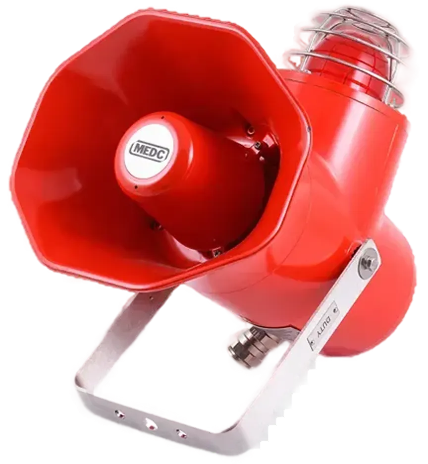 High-output alarm delivering up to 122dB with 28 selectable tones and integral volume control. ATEX/IECEx certified for Zone 1/2 explosive atmospheres in oil, gas, and petrochemical environments.